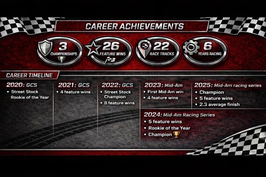 In recognition of his outstanding achievements Scotty was honored with the Rookie of the Year award in 2024. His sustained excellence led to the remarkable accomplishment of winning 2 Series Championships 2024 & 2025, underscoring his impact and success in the Mid-Am Racing Series from his very first year.